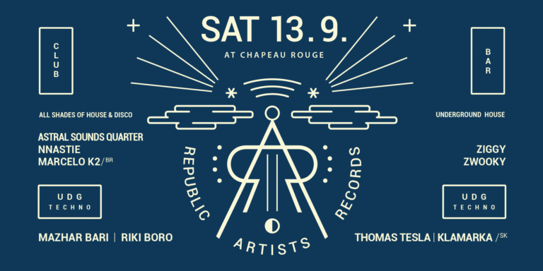 V sobotu 13. září proběhne v Chapeau Rouge pravidelná třípatrová akce Republic Artists!Hlavním hostem večera bude Riki Boro z Kazachstánu, který už několik let působí v Praze. Mohli jste ho slyšet v klubech Bike Jesus, Fuchs2, Altenburg 1964 nebo na jeho vlastních akcích Hedone. Kromě Rikiho se představí i jeho parťák z Hedone Mazhar Bari, […]