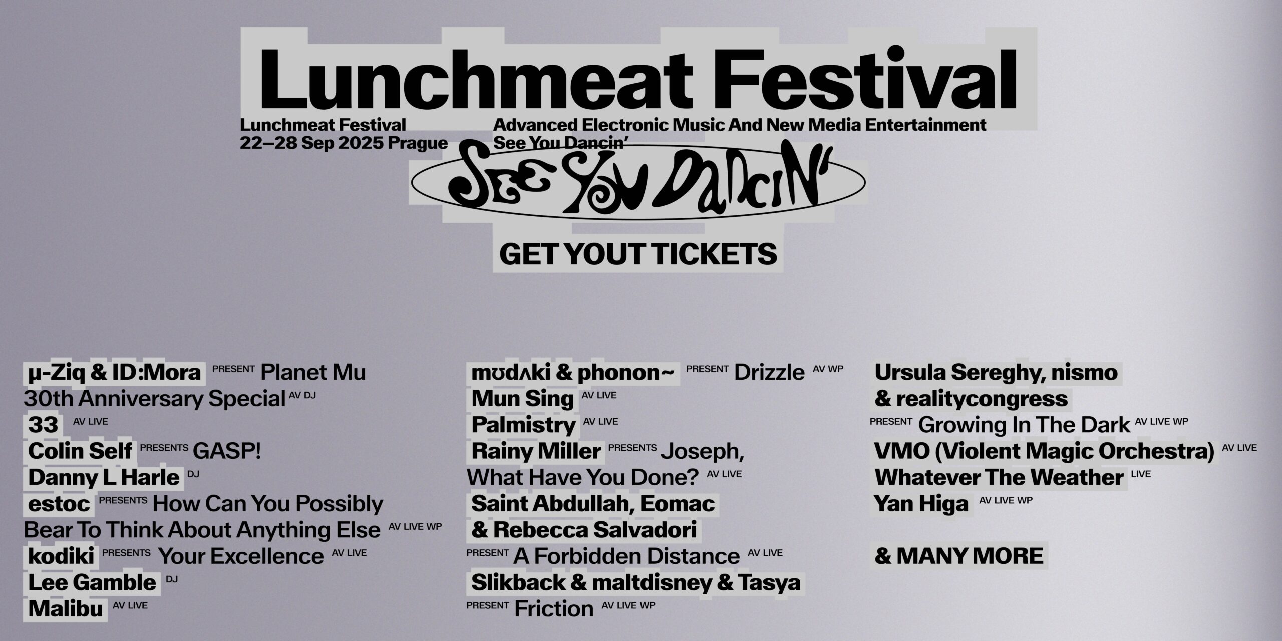 Po dvou vlnách oznámení line-upu už festival odhalil téměř dvě desítky jmen včetně čtyř světových premiér vytvořených na zakázku přímo pro Lunchmeat. Vedle nich se představí zvučná jména současné elektronické hudby, jako jsou Lee Gamble, Danny L Harle, Palmistry nebo Loraine James vystupující pod svým alter egem Whatever The Weather.