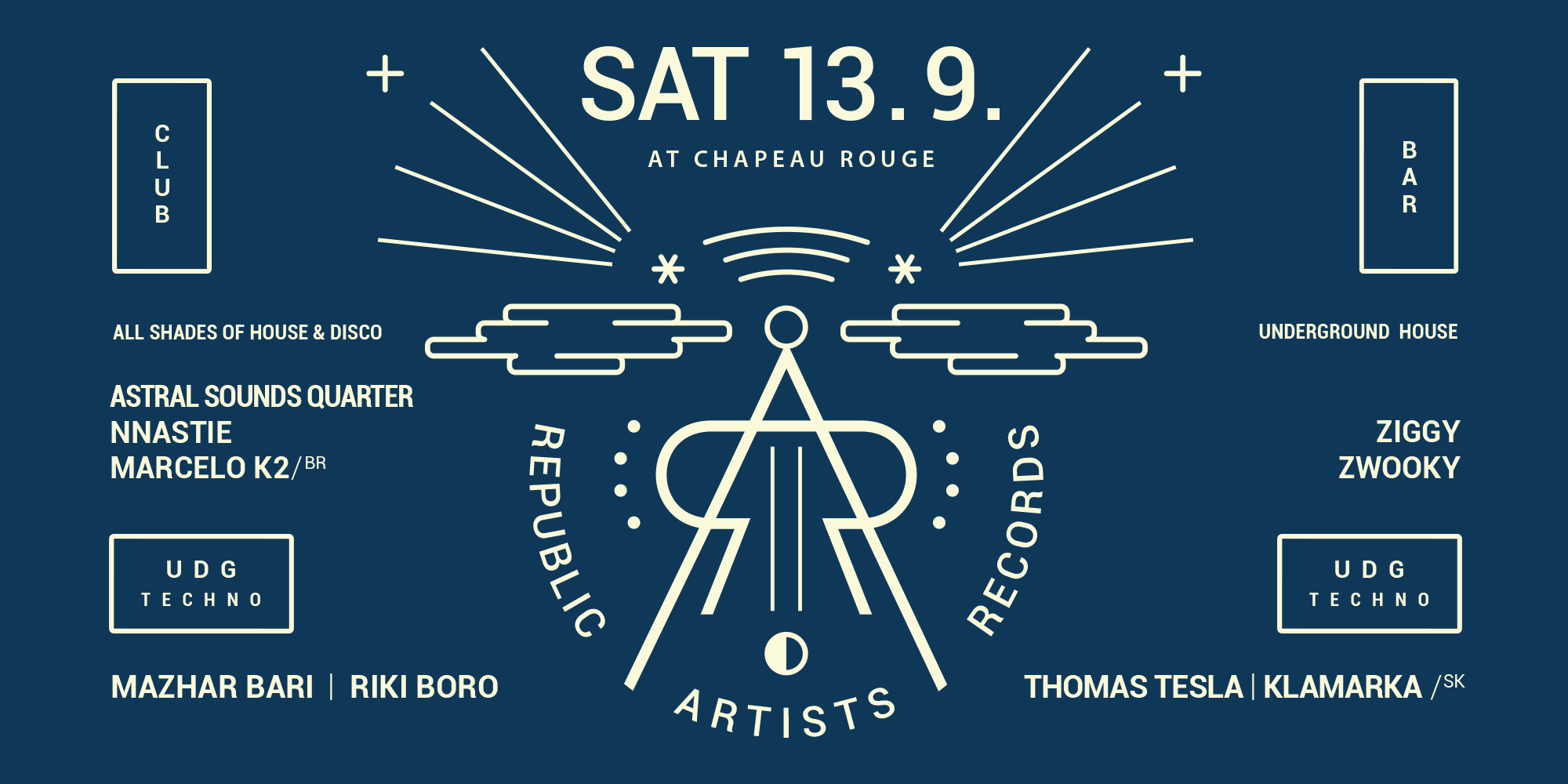 V sobotu 13. září proběhne v Chapeau Rouge pravidelná třípatrová akce Republic Artists!