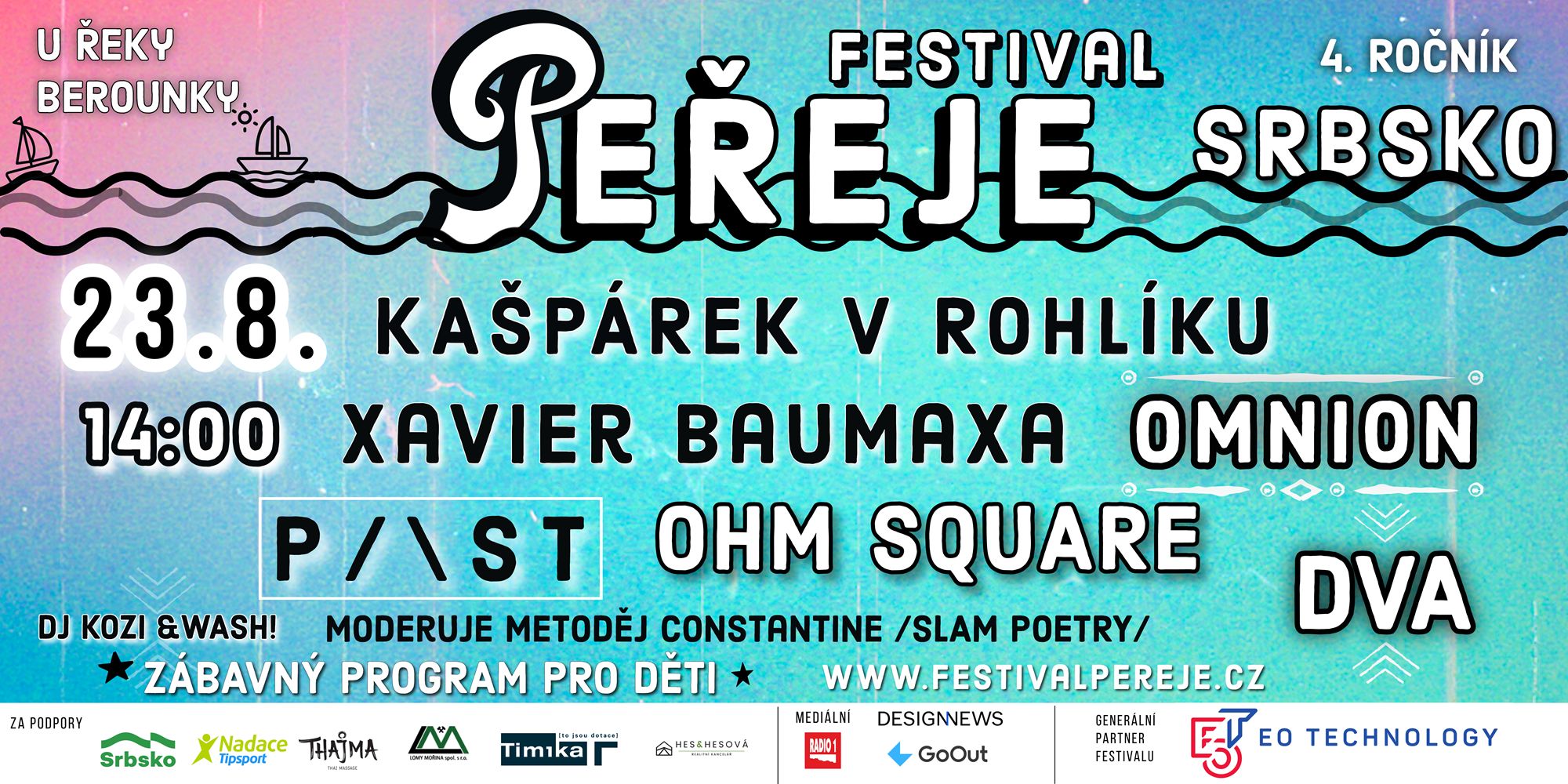 Program startuje ve 14:00, kdy jako první zahraje Kašpárek v rohlíku. Těšit se můžete na hudební duo Dva, Xaviera Baumaxu který zahraje i pár věcí z alba F!asko společně s Janem Čechtickým, dále pak skvělá skupina Ohm Square, která rozvibruje festival Peřeje svou jedinečnou kombinací elektroniky a hypnotických beatů. Těšit se také můžete na Omnion a na konec trochu tvrdší P/\ST.